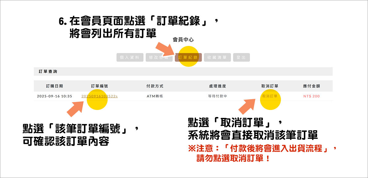 【取消訂單】點選對應訂單的「取消訂單按鈕」即可取消訂購