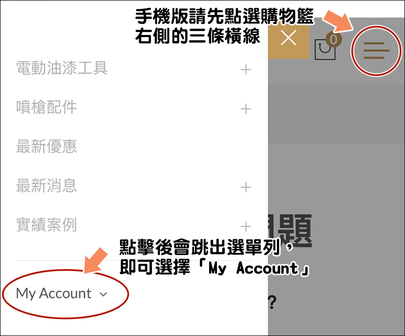 [手機版]點選畫面右上方購物籃旁邊的三條橫線,選擇「Login」登入後,並選擇「My Account」進入個人頁面。