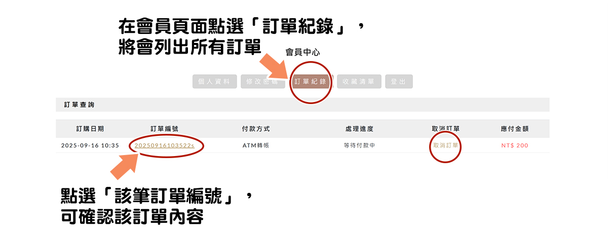 2.在會員頁面點選「訂單紀錄」,將會列出所有訂單