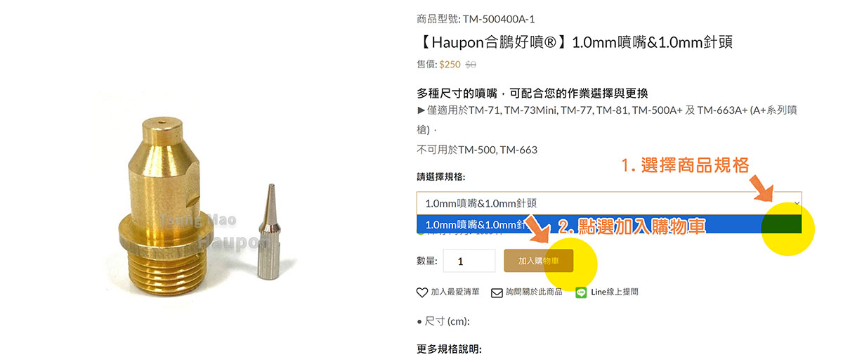 1.請先在欲購買的商品頁面選擇規格、數量,點選「加入購物車」
