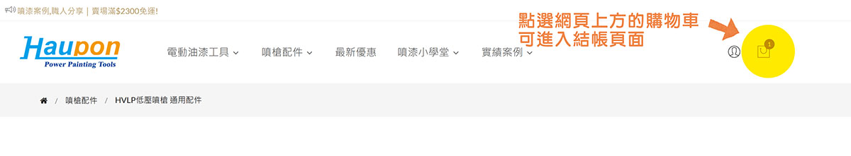 2.點選網頁最上方的手提袋圖示(購物車),進入結帳頁面。