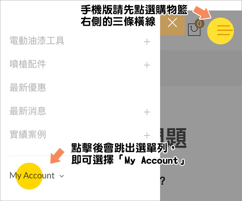 (手機版)則點選畫面右上方購物籃旁邊的三條橫線,並選擇「My Account」